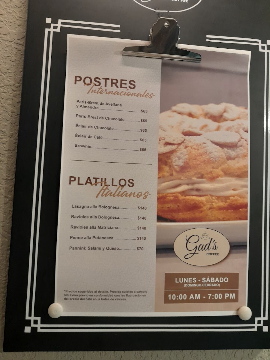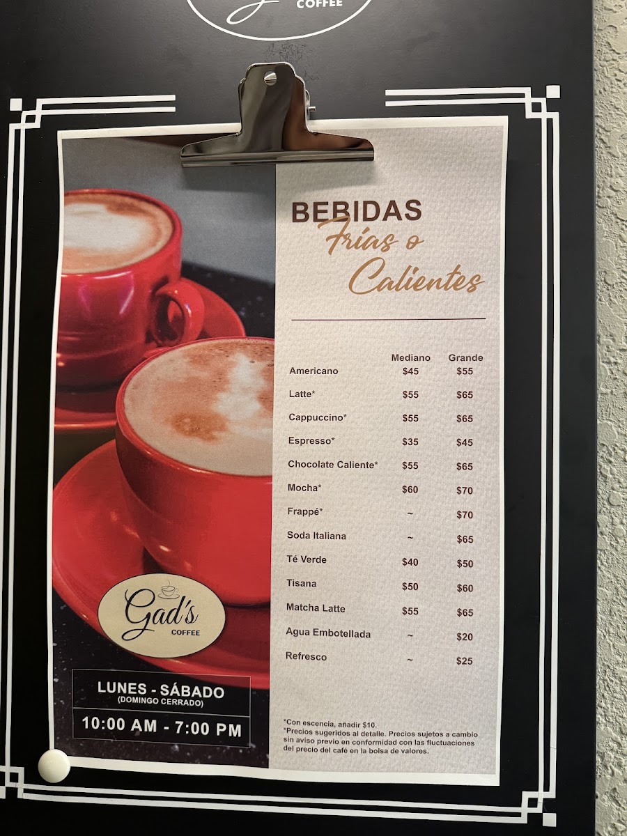 Introducing the menu at Gad's Coffee, a delightful café located in Juárez, Mexico, where quality meets comfort. Renowned for its exceptional coffee and delectable desserts, Gad's Coffee offers a menu that reflects the heart and soul of artisanal café culture.